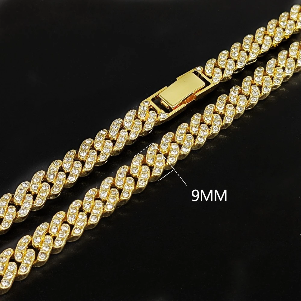 New 9MM Hip Hop Men Women Prong Cuban Link Chain Necklace Bling Iced Out 1 Row Rhinestone Paved Miami Cuban Chain Jewelry Gift